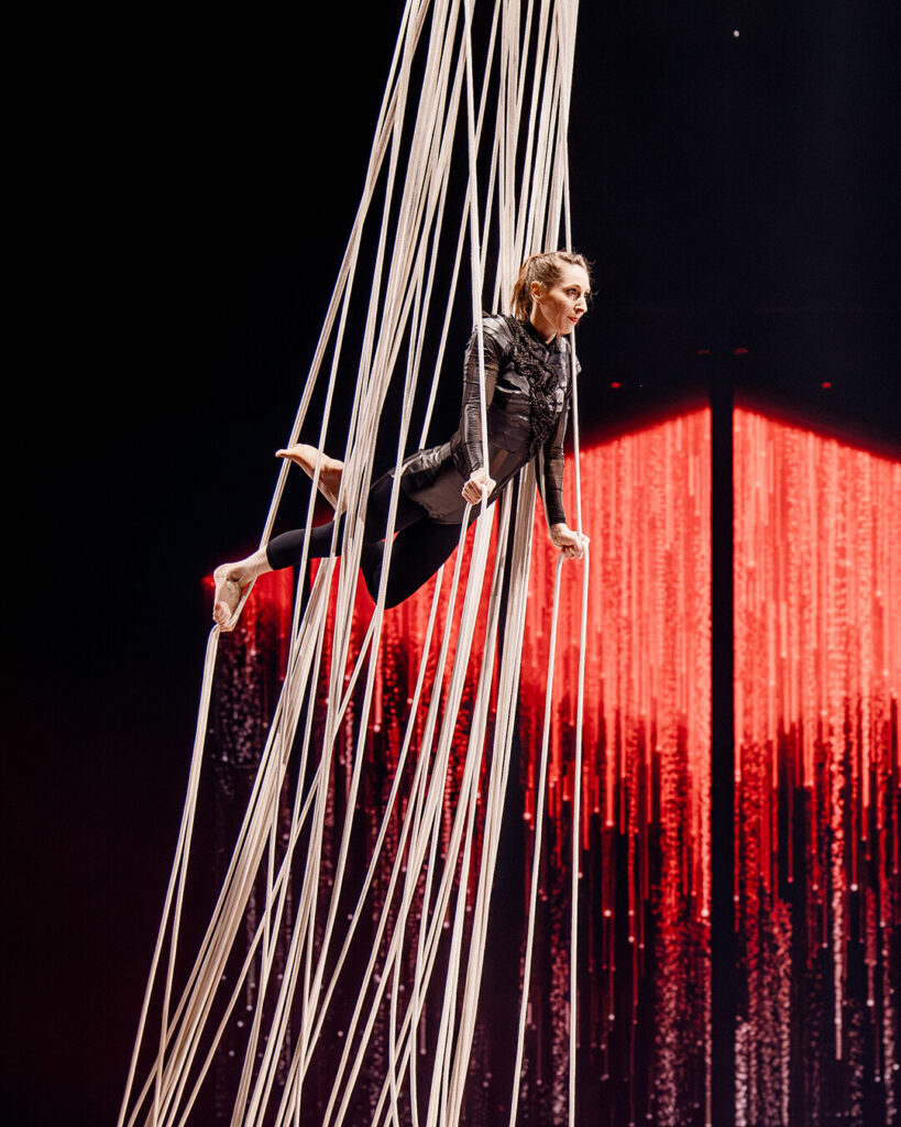 Multicordes – ein faszinierender Vorhang aus kleinen Seilen, eine Disziplin, die Charlotte de la Bretèque während ihres Studiums an der ESAC (Hohe Zirkusschule) in Brüssel entwickelt hat.
