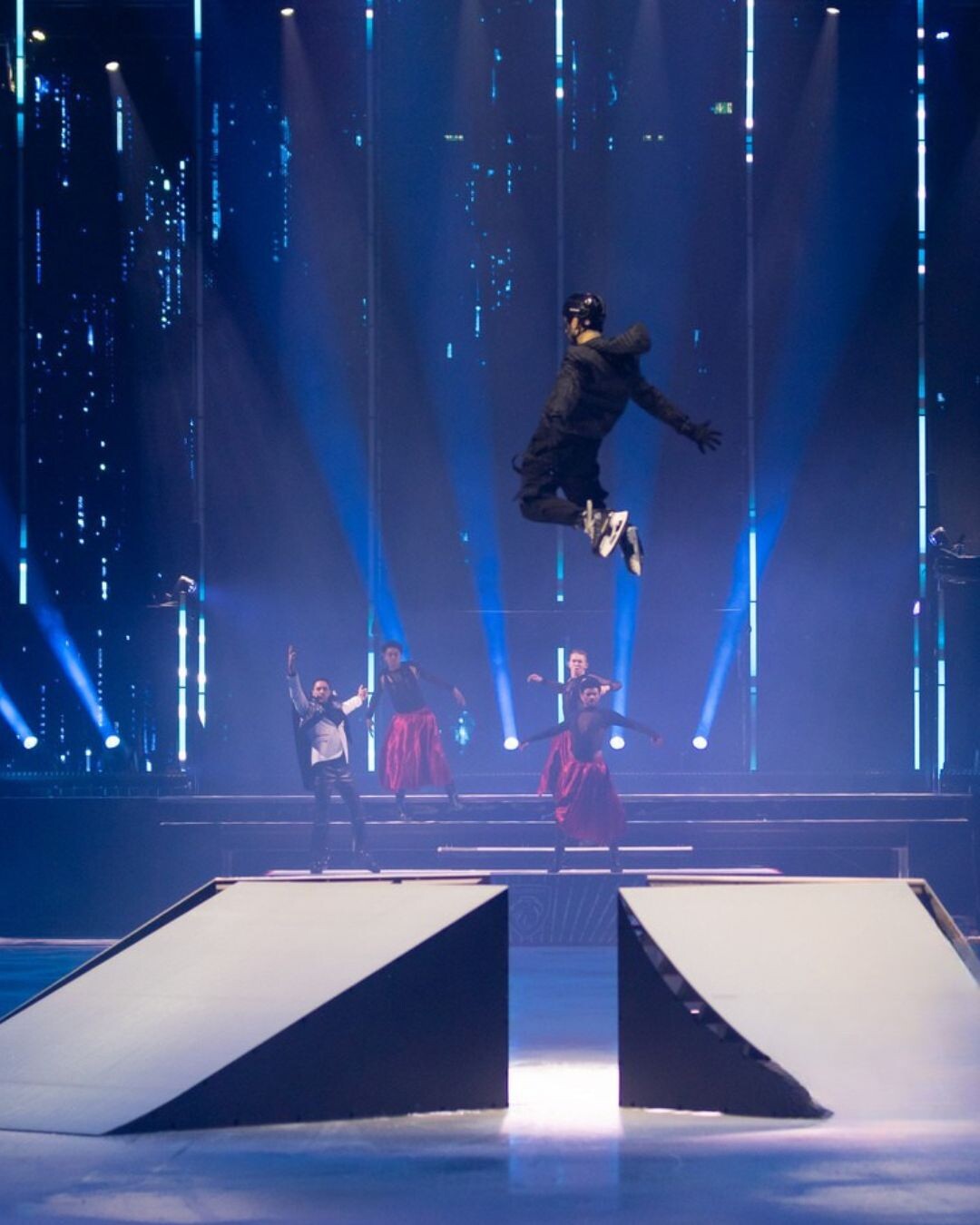 Martin Barrau, Dylan und Dean Moriarity lieben die Extreme. In ihrer rasanten Nummer kann man nicht anders als den Atem anhalten. Der Franzose Martin Barrau und die kanadischen Zwillinge sind Meister des Eis-Rampenspringens und waghalsiger Stunts.